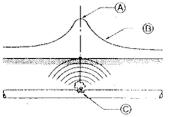 将拾振器固定于听音杆,以听杆底端接触管线或闸阀、消防栓等与管线直通的器件.上,以相同的仪器工作状态在附近几点作比较,声级强、音调频率高的触点较接近管道漏点。如下图中D点: